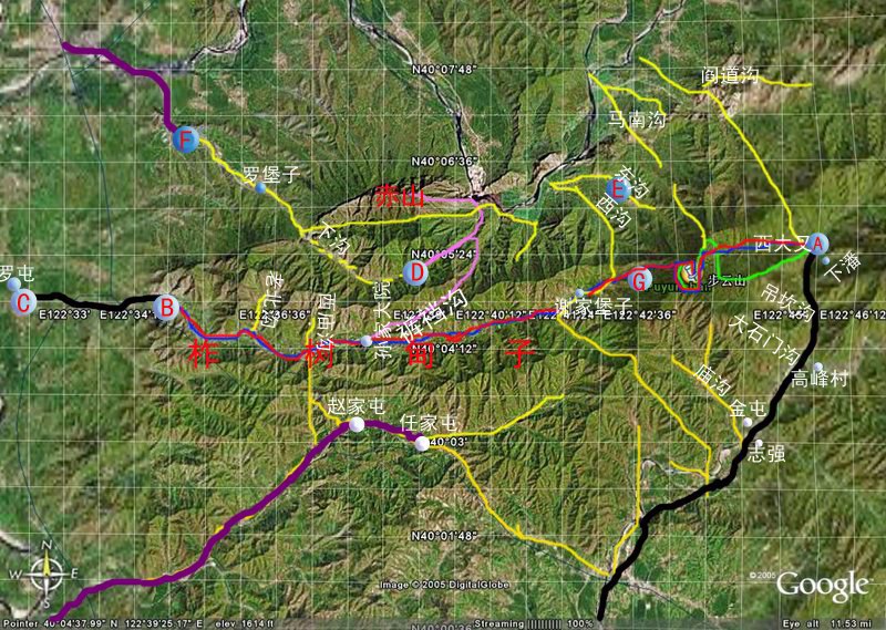 这次没有走盘山路,而是沿着西大叉的沟里向山顶前进,山间有小路,比较好走,遇到盘山路,就直接穿过去,尽量不走盘山路(注意在刚上山时有个岔道,左面一条在落叶松林内的是上步云山主峰,右面另一条看图分析是越过山脊到阎道沟的),加上行进速度比较快,所以只用了2个半小时就登顶了,山顶海拔显示1130米。早上8点半大家登顶后,逗留了约半个小时,照相,欣赏景色后,9点开始下山,在山顶回撤后,在山顶西侧有一条下山的小路,看样是直接下撤到谢家堡子的,沿着这条路下撤了约一个小时,已经里谢家堡子很近了,大家开始吃午饭,因为时间充裕,而且天气很冷,所以大家开始开火做饭,用时一个小时,11点准时收拾好后继续下山,11点47分到了谢家堡子。本来原计划从谢家堡子再上赤山,然后走到那算那,留出3个小时下山到西沟E点露营。这时老树提出,从谢家堡子上赤山的路中间有断崖,下不去,所以改变计划沿村里的路走到孙家大院,然后从裤裆沟上赤山,(图中紫线为计划路线,D点为计划中的第一天露营地)。