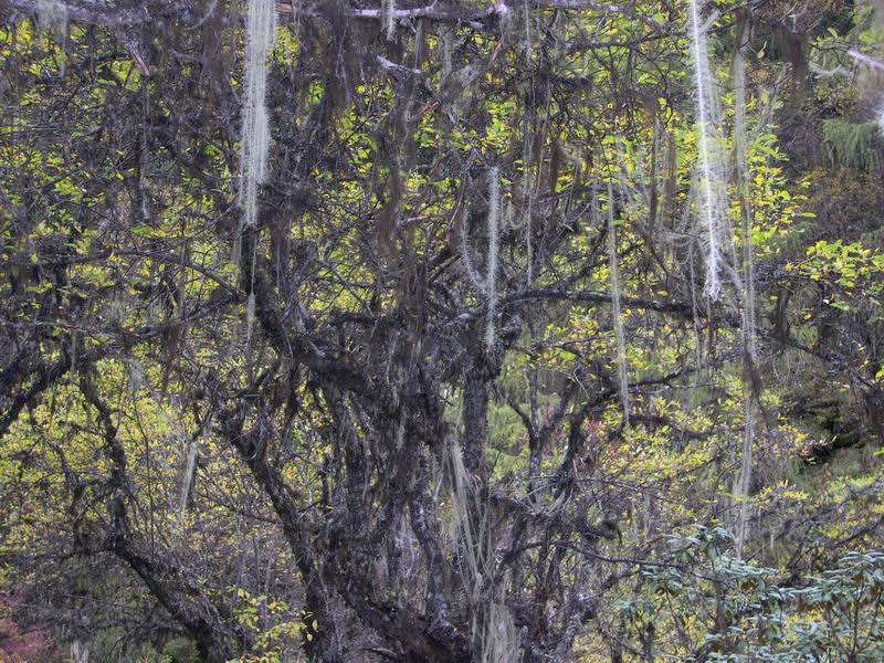 10月1日,我们一行12人进入毕棚沟。进了景区大门,车又往里送了一个小时,到公路的终点上海子接待站,然后徒步2个小时到独木桥营地。走在沟里,天气有点阴,后来起雾,再后来要到营地的时候开始下起了小雨。