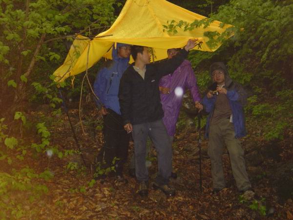 值得一提的是这次同行的男同胞,一路上都很有君子风度。贡献出了自己的地席,让大家放包;然后又冒着雨用外帐给我们搭起了一块避雨的地方,在这样的雨天,让我们三位mm心底里涌动着一丝丝暖流——静静地享受着户外mm的小小骄傲