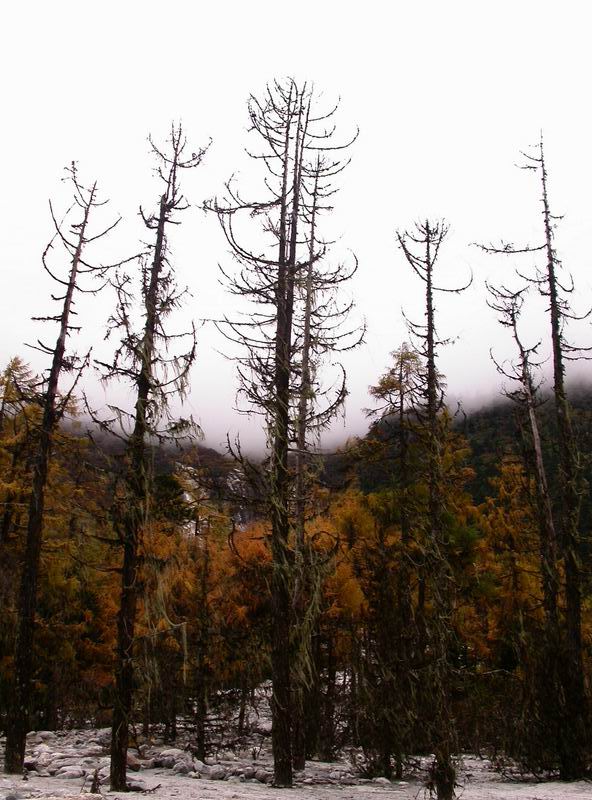 10月1日,我们一行12人进入毕棚沟。进了景区大门,车又往里送了一个小时,到公路的终点上海子接待站,然后徒步2个小时到独木桥营地。走在沟里,天气有点阴,后来起雾,再后来要到营地的时候开始下起了小雨。