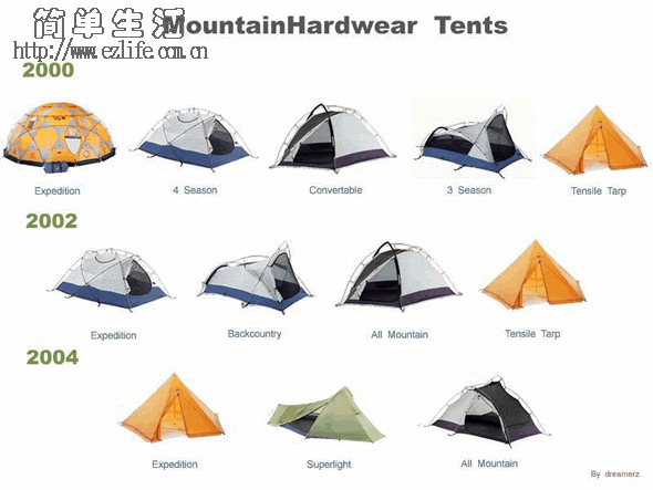 Mountain Hardwear就是一个在帐篷分类上经常调整且比较复杂的品牌。翻开其2000年的CATALOG,其产品分为Expedition Tents、Four-season Tents、Convertible Tents、Three-Season Tents和Tensile Tarps五个类型;其2002年的产品则分为Expedition Tents、Backcountry Tents、All Mountain Tents、Tensile Tarps四大类;而到了2004年,参见其官方网站上,已经调整为Expedition、Superlight、All Mountain(部分早期产品没有在网站上登出,不知道是否已经停产或依然依照旧的分类原则)。