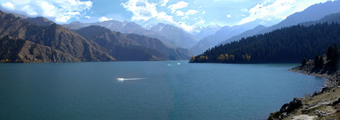 上午游览天山天池,坐游船,观雪峰,乘汽车赴吐鲁番,途经风力发电站大坂城,参观火焰山、高昌故城、万佛宫、葡萄沟 住吐鲁番