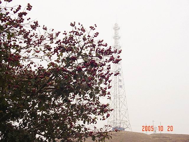 透过山楂树看铁塔,感觉我们的铁塔也挺可爱的。山楂,好吃。以后又摘了山枣、在路边买了诱人的苹果,乡下现在到处都是丰收的景象。