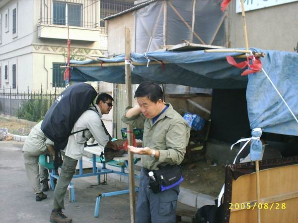 由于避开荆刺林,和叶老商确后顺山沟下撤与11点35分来到山下的小村子,在一个食杂店里开始我们午餐。对夏日穿越午餐能有瓶冰镇啤酒那简直就是梦想,这次叶老把它变成现实,在老乡家把水补足后向下个点出发了。一切都在顺利进行中异想不到的事情就接连发生了,好好先生的一只登山鞋的底全部脱落,只好应急用鞋带把鞋底固定在鞋帮上,再下撤到旅顺中路想把好哥送上回市内的班车,结果旅顺中路修路。我们在路基休整,和叶老合计后我们只能顺公路徒步了,一路的粉尘伴随着我们来到南岔村,要是在这样走下去恐怕回城的将变成三只泥猴了,大家商量后终止本次活动。这次对我的收获可是不小,把鞍子岭至棠梨沟的线路侦察的差不多了,这条线路我争取年内把它贯通。