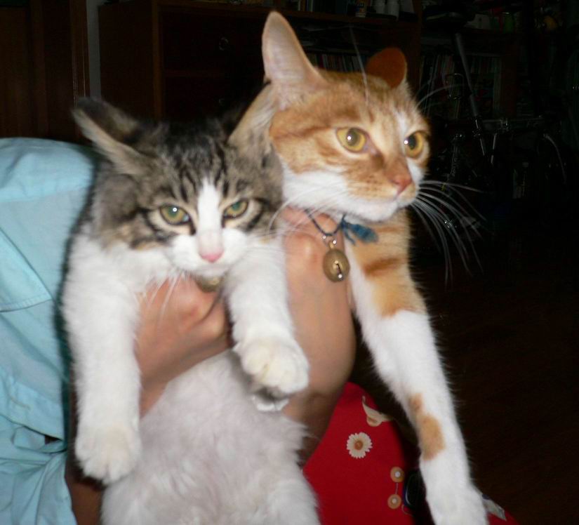 初一是一只三个月大一些的猫咪,15是黄白花的,初一是黑灰花的,以后的日子里,他们要一起吃饭、喝水、玩耍、睡觉、捣乱……