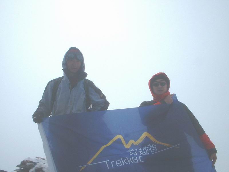 峰顶已经近了,10米,8米,5米……一鼓作气,看着脚下的路,一步步走到了那心中早已梦寐的目标。站在峰顶的那一刻,没有太多的想法,甚至没来的及细细品味峰顶景色,现在回想起来,只记得上面有些许的经幡,除此之外,都是白色的雾霭,也许赶上的天气不对,看不到更加迷人的景色,但是,也因为此,可以更加感受雪山的魅力,在一座被称为不是雪山的雪山顶感受它的多变与瑰丽,这也只是现在回想时的感受,在当时,只有一瞬,剩下的都只是风得寒冷与雪得刺眼。