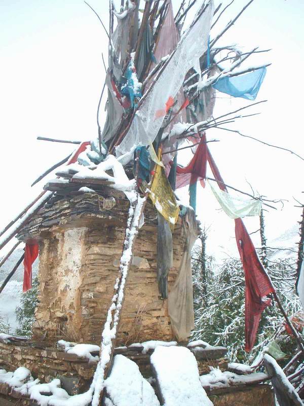 路上的马匹渐渐多起来,驮着各色背囊,叮叮当当缓步前行。一路攀升,插小路上到朝山坪,朝山坪是一块草甸,在这里可以看到四姑娘山四个峰的全貌,不过今天,云雾太厚,把他们包裹的严严实实。一座白塔,孤零零的,积了薄薄的一层雪。这里的白塔太清秀,太干净了,看样子这里的白塔不是用来转经的,倒像是专门修来给游人看的。不远处有一堆插箭,破旧不堪,等待又一年插箭节的到来。