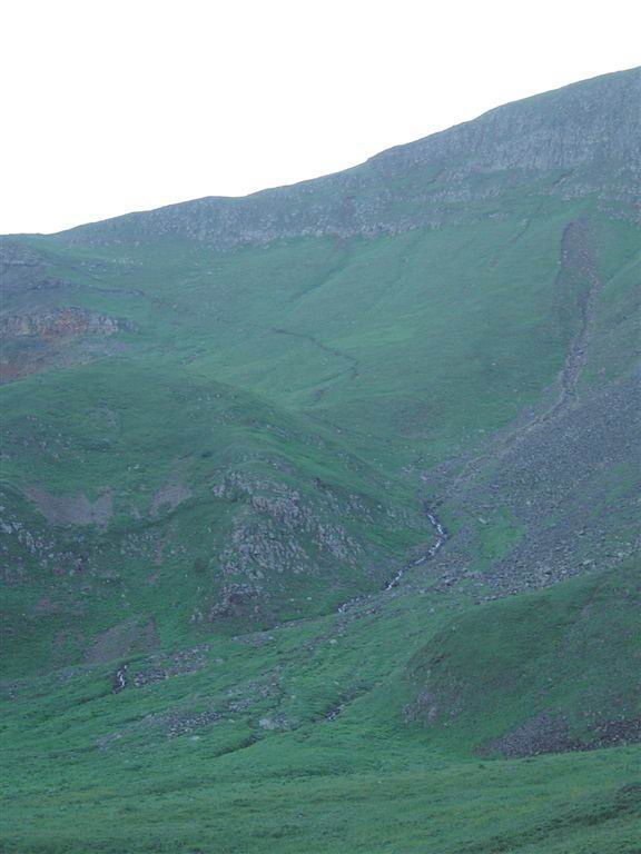 从山上下来的时候,可以看到第一条溪水,也就是露营地附近的溪水,这条溪水比较大,从较高的地方流下来。第二天上路后,向西北走一段,又可以发现另一条小溪,沿着这条小溪向山脊走(可以发现路),就重新上正路了。可以参考下面的图片。