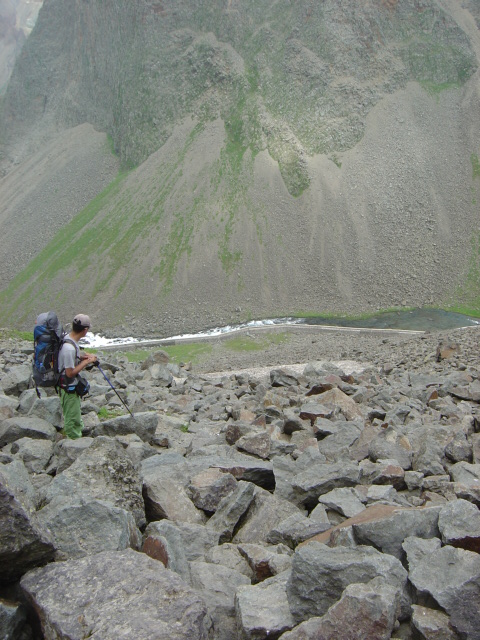 12:45 收拾停当,我们也沿着韩国人走过的小路下山。很险,坡度比较大,而且全是松动的大石块。背着大包,平衡很难掌握。鱼还是很迅速灵活的下到了一个相对安全的草地上,放下包上来接应我。哎,我总算可以原谅他登顶天池的时候超过我的没风度表现了~