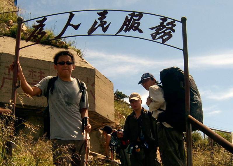 快攀爬到顶时,远远看到昨晚夜登露营的梭非悠闲的坐在石墙上迎接我们,手臂不停的指引即将登顶的同学“左边好上,右边的… … …”。好象乐团指挥在指正跑调的乐手,听我的,没错。(在此地还有一位穿着拖鞋保卫祖国的ZJ籍小战士迎接我们,欢迎词言简意赅:“禁区,不让穿过”… … …结果,尽在不言中。)