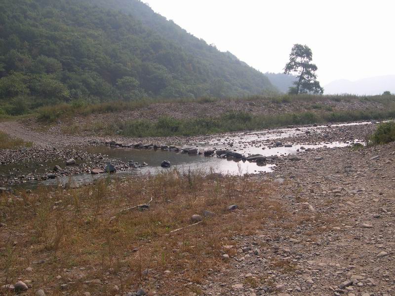 16:10,山势终于变缓,(图中R点)只不过,因为谷地的局促,除了完全由石头搭成的水道外,两侧都是极密的灌木。我们并没有找到昨天下山路段那样的溪边小路。石头水道的行进速度当然没有办法跟土路相比。