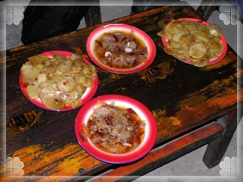 18:40 三菜一汤中的两菜—炒土豆片和炒腊肉,还有一盘炒大头菜上来的时候就只顾上吃了。唉,再怎么自称驴子,一旦有机会腐败,就都露出了本来面目。什么要吃新鲜的大米饭炒菜了,什么要睡屋里不睡帐篷了,切!