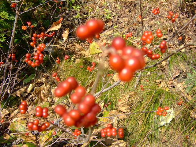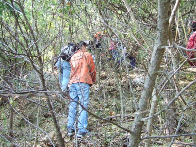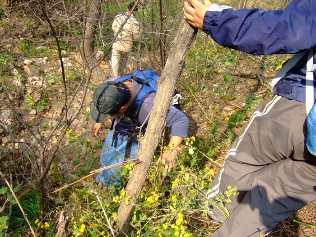 从北河口车站出发,沿公路西行大约十五分钟后,左转进入刘家沟。按照蓝信曾经带过地路线,是从刘家沟果树园子出来的,俺考虑到这么多人,进果园子,可能会引起果农的误会,于是沿机耕路进深,至一地窖处,由好好先生带队进山!首先顺着羊路(道上都是羊粪蛋)一直上升到梯田,然后沿梯田的一机耕路走至尽头,开始奔山顶的防火光测塔位置进发——野路!比较难走!到达山顶后,沿山脊运行至悬崖处,做短暂休息后,开始沿悬崖下撤。就是下撤到蓝信和好好先生带队采山樱位置沟内。下撤的有点难度!到沟底,果然与预期的效果一样,野果特多!只几颗树既满足了大家的采摘欲望!此次活动,没能按照预期目标达到采摘蘑菇的目的——遗憾!沿沟内地缆沟下撤到废弃军营位置午餐!