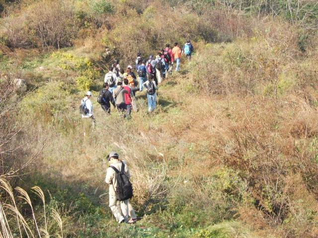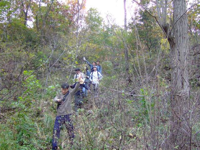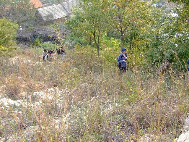 下撤到海边做短暂休整后,本想着,按照计划走黄泥川水库西侧进入旅顺南路;但是,如果那样走的话,有大马路往那边走,如果守着马路走野路,估计多数人都得了杆子了!选择翻山奔黄泥川;虽然有个别同学不太同意,但碍于mm情面,也都坚持过来了!从佛门寺一直奔北方向,沿一条类似机耕路的痕迹行进,沿山脊翻过山顶,开始下撤,一直能够到达黄泥川青年点位置。