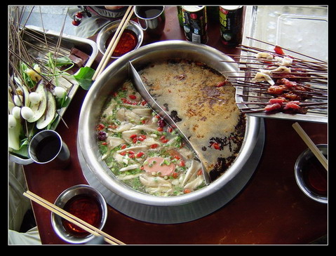 收拾好东西,大家都饿了,于是到外面找个地方吃饭。到了四川,总要尝尝辣子嘛!出门左拐,过了北大街就是一家串串香店,四川的串串香好像是小粉的最爱?不过俺们这三个高头大马的东北人吃起来还是不太习惯,1角钱一串的串串上只有一块