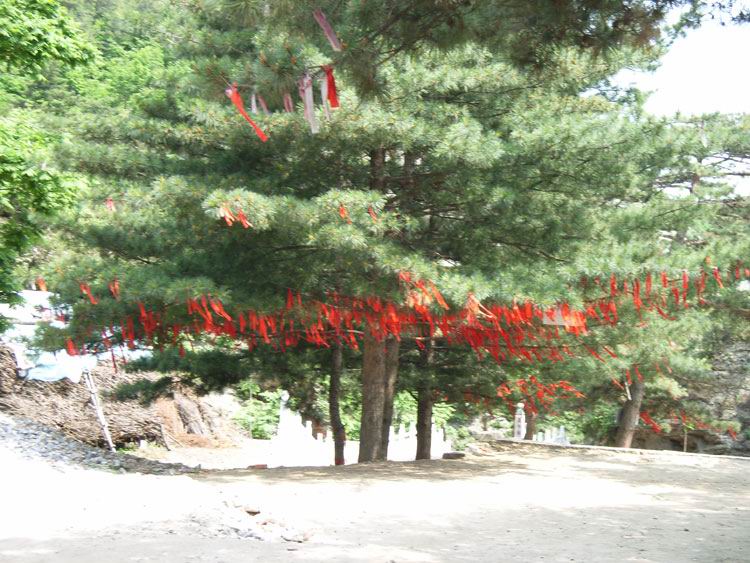 这时老师太与几位居士也安慰让我不要过意不去,没有事。但这事现在想起来我还是感觉特过意不去,这里友情提示各们看官,以后可要小心不要像我这样冒失啊!!过了一会儿那位问我话的居士出来叫岩羊,说师夫要见见他。看来岩羊的佛缘比我深啊,我是硬闯他是被招见的,比我层次高啊。岩羊进去了一会儿出来后,慧圆师夫也给他写了几句话让居士带出来给他,写的什么当时看过,现在忘了。后与师太谈起闭观的事,师太说与她同住的居士小刘去年闭谷不吃不喝了四五十天(具体多少记不清了)呢,真是太神了!!收拾完东西我们决定再上到垭口看看能否穿到水库那边去,老师太说她走过那路,送我们上山为我们指路。延着昨晚上山的路再次上山,老师太体力挺好的,一路上没有休息。到达垭口时遇见了爷三个,经交谈得知三人是从水库那边的村子过来挖人参的,水库的船坏了,他们是划着用汽车内胎自制的小船过来的,我们是不可能联系到水库的船到水库那边的村子的,从山上走太远了得走一天吧。好吧,只能原路返回原计划从水库穿过去到步云山是不可能了,下山后时间够用的话就去孙家窝棚踩线去。我又在垭口拍了几张水库的片子,就开始吃饭了。下山第六次到龙潭寺,这次没做停留和师夫打了招呼后就急忙下山去了,好在昨天上山是走水路上来的,今天下山走的旱路和昨天没有多少重复的,但一路上的风景实在没法和水路相比了,一路也就没拍片。两天来没有怎么被太阳晒着的我们,猛的被太阳这么一晒都受不了,表现最强烈的就是我,最大的愿望就想喝口冰的百事可乐,一路嘟嘟囔囔:下山第一件事就是买瓶可乐喝,放~魂这时也开始有意挑逗我,给我讲:拿起一瓶冰得的瓶上粘满着水珠的百事可乐喝一口,可乐咕噜滑过喉咙......想想都要疯了,一瓶冰百事可乐就是我全部的愿望......就这样在半疯中我们下了山,看到了山门我健步如飞地奔了过去,还不知残酷的事实在等着我,除了山区小厂出的那种劣质饮料外没有其他任何饮料......还好我比较抗造,没有被残这酷的事实击倒。为了我的愿望,为了那口冰的百事可乐我们继续前行。进村子找到了唯一的小卖店再次令我失望。