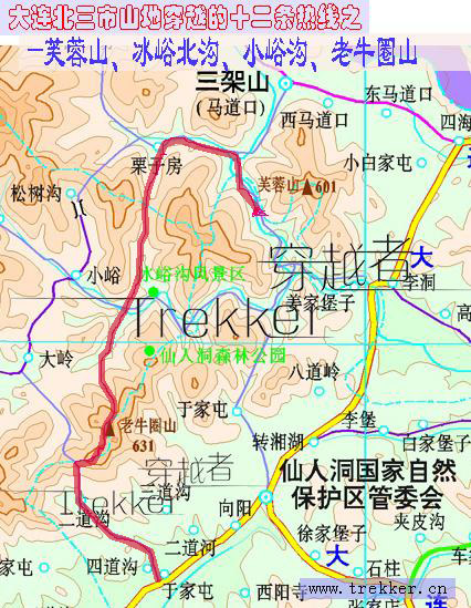 组织者: 石头 参加人员: 1组:梭斐鱼 BEAR 林栖 蓝信 蓝信+1 冰河 2组:飞 弧、土拨鼠、东子、impink、kitty、alian JACKY 3组:bluepink、天鹰、俊风、大堂主、石头、卓尔、静石 时间:7月1日2日 交通方式:包车,大客车,1500元 行程:7月1日晚从沃尔玛停车场出发,23:00到达于家屯,顺着进山的泥路,伴着溪水,大约走了一个半小时,到达山底下,一个叫二道沟的地方。在小溪边7月2日1:00露营入睡,早晨4:00起床,5:00准时出发。向山顶进发,经过一段急剧上升阶段后,走入山脊,开始还有可见的路,后来就路没了。由于山中雾大,能见度极低,辨不清主峰,在绕过一段悬崖后,顺着山谷下到了一片采石场。远处俊美的山峰和近处劈开裸露的岩石形成了显明的对比。一打听才知道这是硅石矿,这就是庄河的著名的硅石矿吗?怎么会在如此美丽的景区内? 伴着矿底的小河走,到了一处叫上韩的地方,组织者决定放弃登无名山,转向沟底走,是一个平缓的山坡,为的是要尽快的联系上2队。现在回顾线路,不知道2队的露营地点其实就在无名山的后面,1队的穿越绕过了无名山半圈后同2队汇合的。当时如果知道2队的露营地点组织者一定会穿越无名山的。从山下看,有很明显的山路通向无名山,个人认为穿越无名山不会很难,而且也能够到达北沟的露营地。不过沟底穿越也有好处,一路有流水相伴,别有一番意境。这也是本次穿越的最大特点!走到了道口后,让大客车来接我们,15:00在北沟与2队汇合。 穿越耗时:约10个小时。