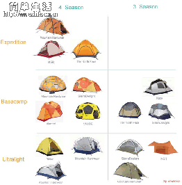 MHW分类上的复杂多变是个典型,其他的品牌大多就比较简单了。www.mountainhardwear.com   The North Face:Expedition、3 Season、Ulrtalightwww.thenorthface.com   SierraDesigns:Basecamp、4 Season、3 Season、Convertiblewww.sierradesigns.com   MSR:4-Season、Convertible、Ultralight、Fast&Lightwww.msrcorp.com   Marmot:4 Season、3 Season Ext.、3 Season(www.marmot.com )   Kelty:1 Person......7 Person(www.kelty.com )