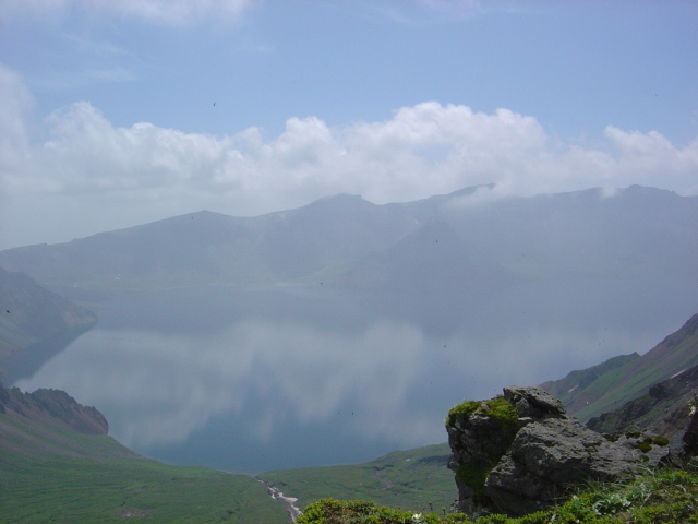 7/16 500 感觉中鱼起得更早,不记得了,反正我睡得很香很想赖床不起。苦于第一次和两位兄长出门,好歹也得装的淑女一点点。。很惭愧,鱼已经做好了早饭。我们在小河边吃了早餐,然后梳洗打扮。高山上一棵树也没有,一马平川的草甸,我没地方上厕所了。。:( 700 我们将要出发的时候,看到山上下来了一队人马,在我们的上游休整,好像是韩国人。之后的穿越行程中,我们一直与之为伴,也幸好有了他们,让我们有了一个免费的向导,而且他们队伍中还有个中国人~~ 经过一夜的调整,我又精力充沛的跃跃欲试了。因为山路清晰,鱼让我走在了前面。也因为我只有走在最前面的时候才不会唉声叹气喊累,反而是健步如飞~一路上我担心韩国老太太们超过我们,给中国人丢脸,不时地回头看着那队人马。他们因为是轻装,渐渐的离我们越来越近了。我当时想,如果被韩国老太太们追上了,我就说日语,让他们以为是小日本好了~ 900 在白云峰下,我们三个卸了大包,轻装爬上了白云峰顶。啊,真的是无限风光在险峰,也真的是名副其实的白云峰!也就在这里,远处连绵不断的云层映衬着高山,把我们的视线从天池那里拽了过来;当然,一路只要走上山脊,我们都会与天池相逢,多多少少的对天池已经有点审美疲劳了。。
