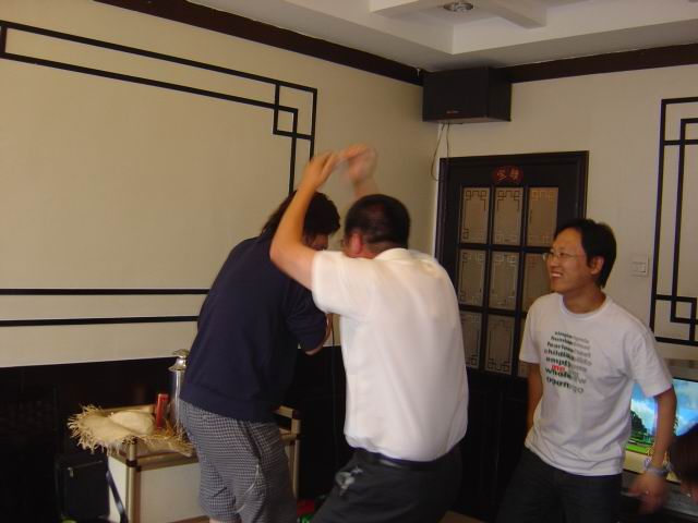 那晚,在胖六家腐败。胖六想出了个馊点子,大家彼此写下惩罚性的游戏内容,然后抽签。 也不知道谁那么恶毒,要求吃下一个饼子,不幸被俺抽中还好,当时的土豆舍身相救,俺换成了他的讲讲出连故事,哈哈。那时候大家都以拍饭票为乐,看看背景中ZY的淫笑吧。 hV1vHzIX.jpg 真是恶有恶报啊,看ZY的钢管舞~~~ 3rKlRKgo.jpg 胖刘总是那么幸运的抽中和GG亲密接触