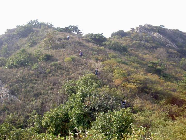 行程:早晨8:20集合完毕,由信用证带路沿北河口南侧的山路上山,在一个小山坡上,建有一个观音台,能看到小平岛的全貌,到山顶后,沿着铁丝网的外围走,有还算明显的山路,在最高的山峰处建有一个火灾观测塔,这是这条线路的标志,过到达这点后可以有多种走法,信用证说可走南部的山脊册(图中的虚线部分),可以走南侧的山沟,也可以走北侧的山脊。我选择了走北侧的山脊,这是信用证没走过的线路,走到山腰处,有一条备战路,(其实已经长满了树,中间只有一条小路可走)。现在回想应该顺着这条路向山上走,我选择了向下走,在山腰处有一块很平坦的柏油路面,我们在此吃午餐,此时为11:40。