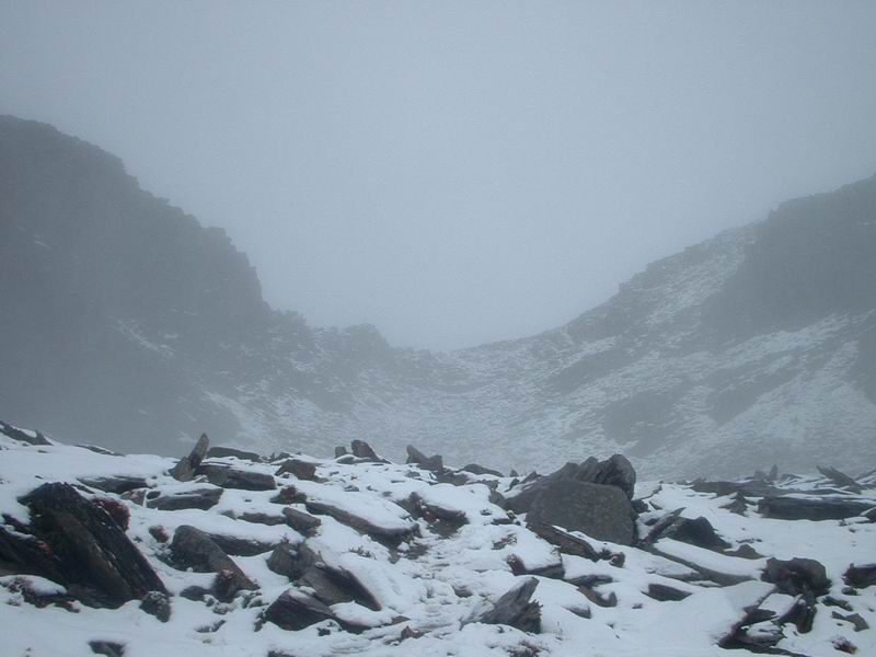 一步,一步,一步,色彩丰富了起来,那是帐篷的颜色。有些兴奋,但已没有多少力气了。大本营是峰顶下面一片比较平的草地,说是草地也只是勉强,山上的雪水汇聚的小溪从草地上穿过,本来应该是一片美景,但是现在,到处是水洼,白雾笼罩,分明是一片阴冷的感觉,真想点上一大堆火,烤烤潮湿的空气。搭好帐篷,已经不想再动弹了,一点都不想动了。钻进帐篷,换上干爽的衣服,把能穿上的都穿上了。只感觉脑袋象浆糊一样,昏昏厄厄。