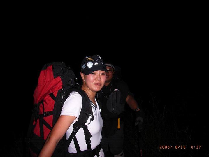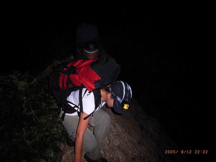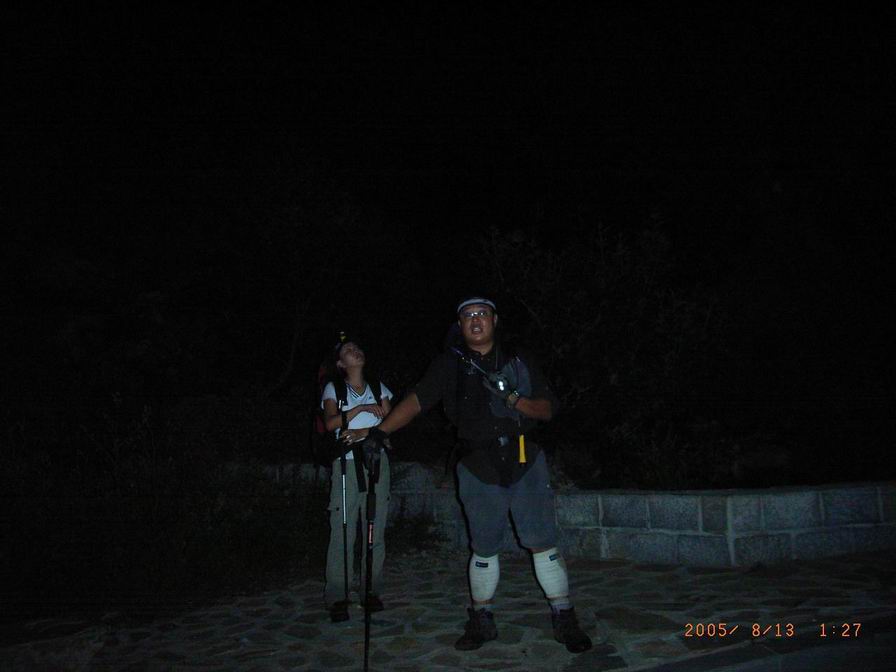1951我们到达大连大学,没吃晚饭的NICOLE坚持不吃也可以成行。OK2011我们到达观音阁大门口,右转上山,1小时后我们到达山脊,用上次定向比赛的奖品手电,我们开始了向主峰的进发。心中带着对流星雨的盼望。微弱的照明,险峻的山路,兴奋的心情,稳健的脚步,沉重的背包。2230,NICOLE饿了,几乎是就地休息打尖,我和叶绿素吸支烟等待小N23点多一些,我们发现我们没有走预计的路线上,我们多走了一个山坳,除非回头,否则不能从信号塔处的柏油路下到点将台-我们计划中看流星雨的地方。试探性的横切被大家一致判断为不可行,决定跟着清晰的小路下山,预计出口在点将台-朝阳寺之间的公路上,缓慢的下降,伴随着NICOLE激动人心的尖叫(我的心乱跳,以为遇到了蛇,实际上是蛾)我们下到盼望中的公路上,叶绿素-我们的开路先锋辛苦了。一次LOSE WAY,竟然走了一条信号塔下到点将台的土路,也算意外收获。