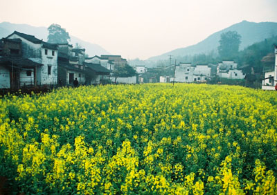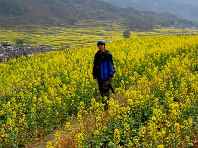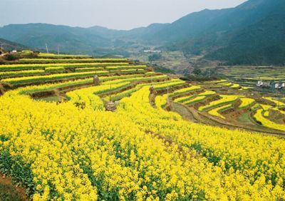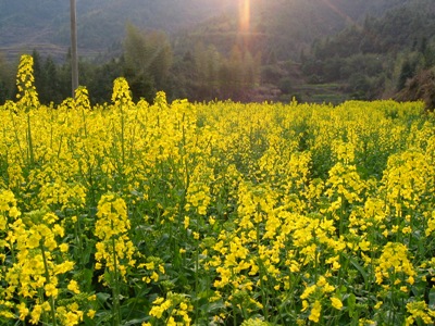 ——第一次走进油菜花地,近距离看油菜花,闻油菜花。虽然李坑的油菜花地比东北农家的自留地大不了多少,而且还竖着牌子:进地罚款。可是,谁能抗拒阳光下大簇嫩黄的油菜花娇艳艳地向你耍嗲呢?我不能。啉哒也把持不住,走进油菜花地回眸一笑,镜头里一片嫩嫩的鹅黄色包裹着她,顿时理解梅艳芳那首《女人花》的意境:女人花摇曳在红尘中,女人花随风轻轻摆动。。。