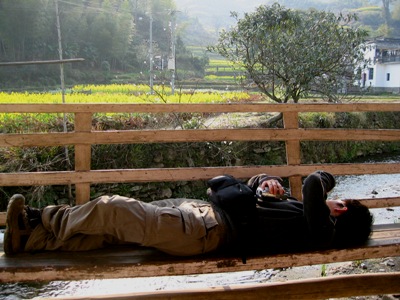 ——第一次他乡遇故知。知道自游族先到了批好色的驴子,以为我们是迟到的游客。不曾想李坑第一站就不期而遇老太J。不去形容当时激动拥抱的场面,只说当时正在录像,放下机器就奔向老太J张开的双臂,结果没关机的DV闷在包里,忠实地录着黑漆漆的包内一道光线透过拉链缝隙洒进来,时间长达十几分钟,背景声音是揪成一团的说笑。回来给朋友回放录过的景致,朋友笑这段录像的失误,却哪知道当时惊喜交加的心情。