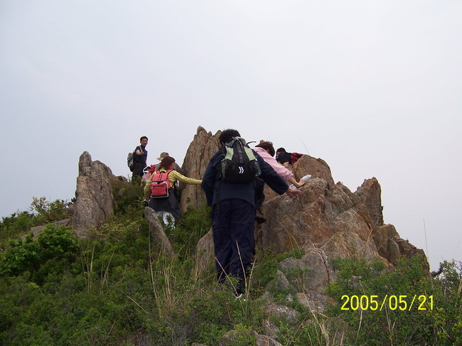 参加人员:静石、灵石、吉普车、SUV、吉祥、弥猴桃、银河、盖州人、美奂、alian、旱收、WZ、福气共计13人。  行程安排:2005年5月21日,天气不是很好,预报是小阵雨,早晨下了一阵,觉得不会下大,所以待大家询问是否还去时,很坚决的回答:“去!”。集合时发现,没一个人改变注意。将13个人塞进一辆面包车中,顺着旅顺北路直奔陈家而去,一路无雨,到达陈家时,开始下雨。还好小雨下得时间不长,就停了。大约10:30左右开始登山。顺着明显的山脊走,在远处看了一眼灯塔,和黄渤海分界线,因为下雨,视线不是很好,模模糊糊分不清。这不是我们的主要目标,顺着山脊向上继续前进。路上看到了几个很平的水泥台,不知是做什么用的,是专为我们露营用的?哈哈!上周有人在这露营。继续前进,天公不做美,又开始下起了雨。在雨中继续前进,直到有人饿得受不了了,不走了,在主峰的山脚下开始锅造饭。吃饭时间大约用了一个多小时。吃饭的时候并不知道主峰就在头上,结果吃完饭,我们没有登峰,有点绕了远路,接近主峰时,山上的士兵老远是出来“迎接”我们,我没有现他们打交道,顺着台阶下山,这里的台阶很容易让人起大黑山的台阶,到底之后都是盘山公路,公路很多,岔路也多,也许是因为阴天没有太阳的原因,也许不明显的转弯太多?第一次感觉到找不到方向了,幸好有人拿着指南针,确保我们的大目标是正确的。回想一下所走过的路线(图中的黄线), 在主峰附近我们还是有些绕远走了。不过本次穿越都是在山脊山进行的,没有专门去走盘山路。大约16:30分左右到达柏岚子村。 感觉到老铁山还是很神秘,不是一次可以读懂。有机会还得去体验一下。 穿越时间:5个小时。 交通攻略:9:10分有旅顺到陈家的大客车,14:00左右在柏岚子有回旅顺的大客车