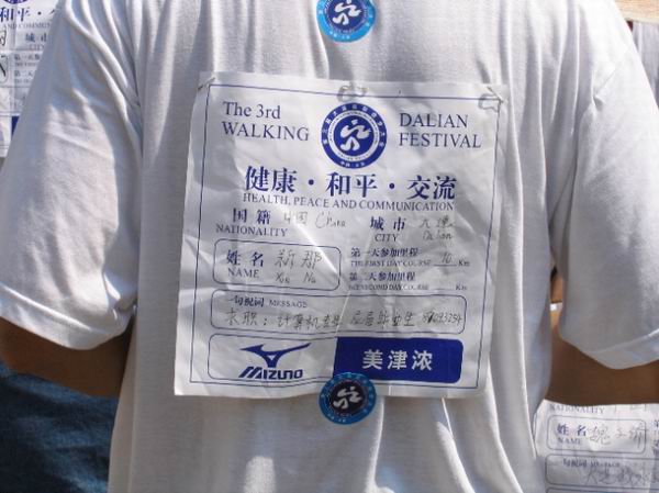 我从8.40开始,下午2.00回来.我是带着儿子一起走的.开始的时候人很多,基本上是在人挤人,走不开,到了10公里转弯处往后,人就逐渐少了,11.00钟我们在同香山庄盖完20公里的印后,在林荫下吃的面包和火腿.然后到付家庄公园内陪着儿子在海边玩打水漂,玩够了后一鼓作气回到终点.