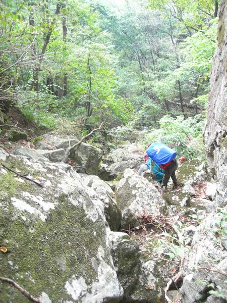 进山的机耕路好象要一直延伸到山顶上,车轮的印迹也很明显,看来是经常有走车的,走在上面心里也能踏实一点,毕竟经常有人的地方,野兽会躲得远一些。走机耕路还是很省力的,可是还没等爬升多大的高度,机耕路就被山间的洪水冲得无影无踪了,就剩下一块块岩石铺成的河道。