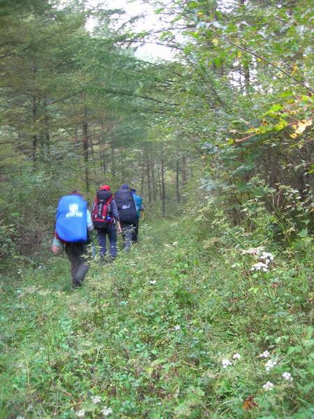 根据老乡的指点,我们在下车的位置就能看到韭菜顶子山的主峰了,可是可是,这个距离也太远了吧(PP里最远处的高山就是,那看见主峰上有个月芽儿形的山坳就是)!没办法,路程还得是我们自己去走。背上行囊,开始我们的跋涉,可是心里却总想着老乡说的熊和野猪,难道这回上山就这么危险吗?心里也开始怯起来……但表面上还得表现出毫不惧怕的样子,心里却开始自己宽慰自己:大本溪生活了好多年,很少听说山里有熊伤人的事情。