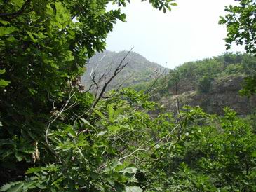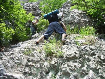 包车来到孙家窝棚下沟圣水寺下院与司机定好四点半准时来接。在向上院走正被太阳烤得不行的时候,走在最前边的我忽然感觉眼前一亮,哇~~迎面走来一美女,说她是美女可不是我在山里见不着人标准低啊!!就那质量在城里见着了回头率也绝对百分百,那就叫一个白啊!!上穿坎袖上衣,下穿及膝短裙。魂魂这时也来了精神,大叫变换队形,本来右侧通行的我们变到左侧通行,就在这时大美女做了个令人销魂的动作,轻轻地弯下腰向下拉了拉短裙(不在现场是无法理解那种销魂蚀骨感觉地!!)靠~~我们很匪吗?美好的时光总短暂的,她后边跟上要不是三个壮汉就完美了!与龙潭寺相比圣水寺开发的很好,寺庙建设一定的规模,香客也不不少,路上遇见那三男二女就是来圣水寺上香的。到了圣水寺上院刚刚坐下,就从斋堂里冲一胖女人很不客气:“你们干嘛地?旅游的吧,小点声啊,师夫们都睡觉呢。”这种地方多待无益,走人上山。在半山腰找了个有水背阴的地方开始造午饭了,饱暖思淫,吃饱喝足后三人自然是对路上那美女一通意淫××××(作者此处删去二百字)。要上山出发,魂魂提出他不上去在原地看包,给他留下对讲机后岩羊与我便上山了,去找传说中的水帘洞。万福山区的植被都非常的好,圣水寺后山上都松树林遮天蔽日的,上山的小路十分清晰四十分钟左右就上到了山顶了,我们又向下走了一点,路挺险的就在悬崖上,转了过去对讲机就没有信号了,拍了几张片子后就回去了。下山到圣水寺上院,遇见了不少香客,还有两村姑级美女,走在前边的我急忙用对讲告诉后边的岩羊和魂魂,二个飞下山来看了后总结:虽不及上山见的那个,但好歹也是个女的啊!!将就看吧!圣水寺的条件很好有机井把水抽上来并安了水龙头以方便洗漱,我们自然不能放过这机会,在我和魂魂洗脸的时候两村姑级美女走了过来站在我们身后注视着我和魂魂,顿时我心潮澎湃,哪还能有心意洗脸啊,该不会是遇见女贼了吧,这脸不要,起身回头盯着两村姑级美女看,两人走到水龙头前一个要洗腿,靠~~不会吧,难道在挑逗我和魂魂?这种级别的艳遇我需要吗,我得好好想想啊!自做多情中......呵呵,原来是腿破了啊,岩羊走了过来:“腿破了啊,呼噜你不是有消毒巾吗,快给拿点”,姜还是老的辣啊,就这么让他送了个空头人情。擦完走人了,岩羊说要刮胡子!?让我去给他借个镜子@#%%¥&我疯了......