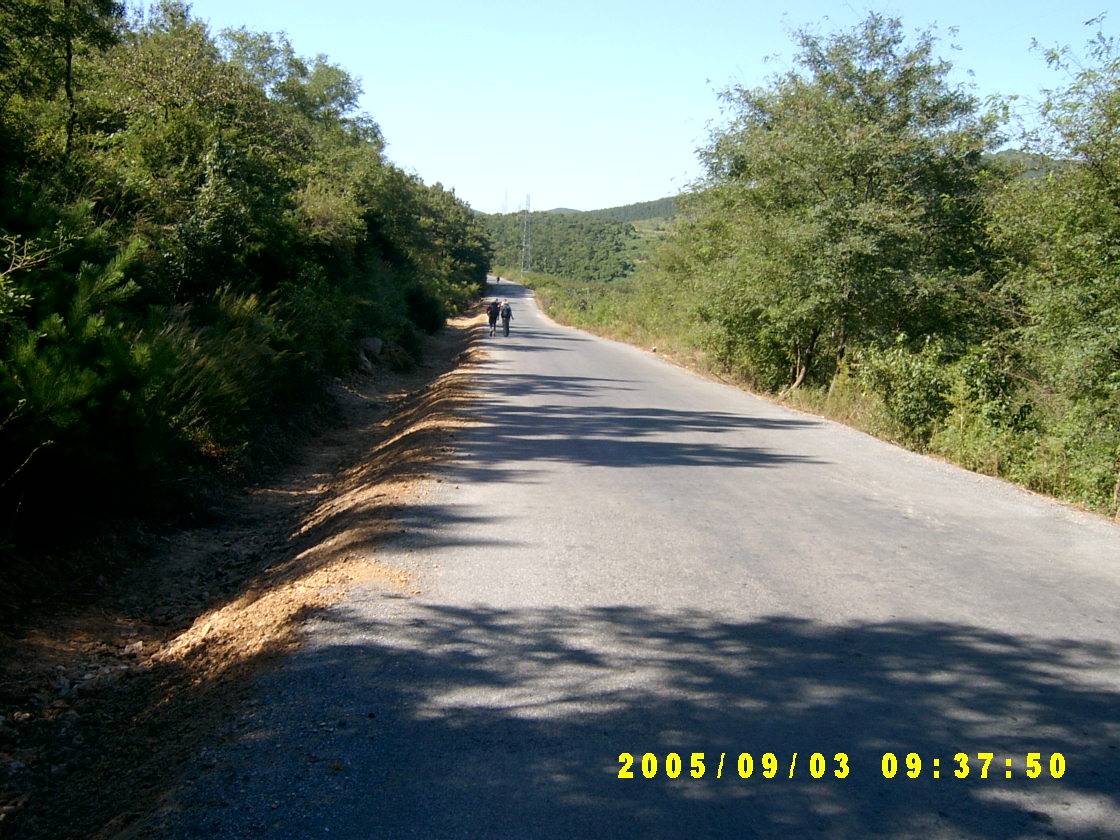 又是一个小时,队伍在一段正在修路的道边沐浴着尘土休整,脱鞋看脚,惨,水泡已经豁然贴在脚上… … …(事后总结:我30公里以上的徒步走过不少,时速一般保持在四公里左右,脚上出水泡的机会并不多,这次有点盲目跟快了,而老布他们没有任何问题,看来每个人都有自己的极限节奏,超出这个范围,嘿嘿,等着痛苦吧)。