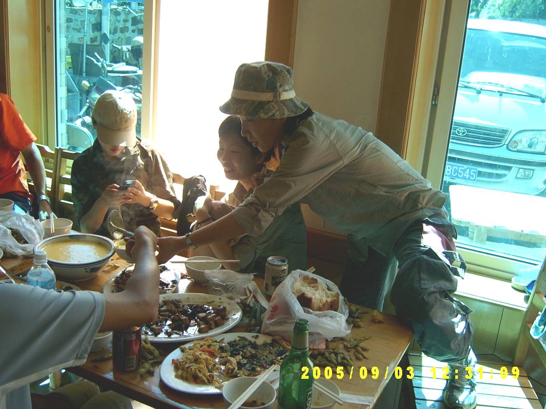 队伍快要走到龙王塘,听说已经有人脚上起水泡了,我和其他几个同学都换上了备用鞋,alian 更是换了凉鞋上阵,其间还美滋滋的宣扬穿凉鞋暴走的好处——最大限度的给十个脚丫子提供摸爬滚打的空间。(事后总结:穿新鞋长距离的徒步是不可取的,把脚和鞋放在这里磨合实在是个愚蠢的做法。)
