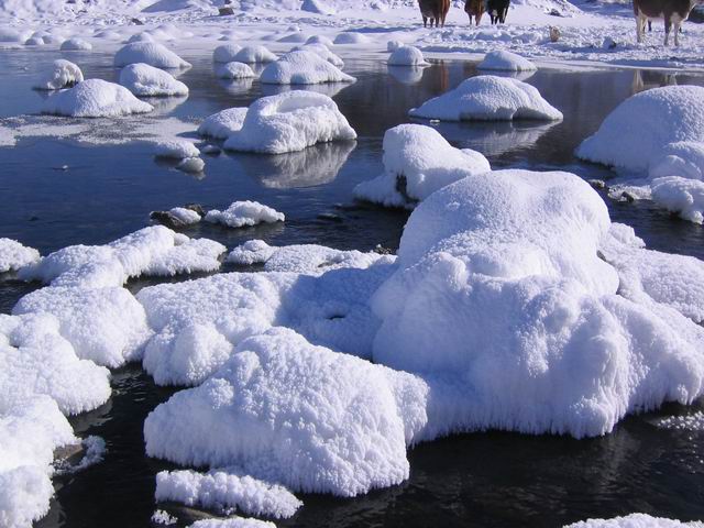 D4. 清晨的空气很新鲜!雪覆盖了所有的尘埃,呈现阿尔山纯朴和率真的民风.我们所有人很自觉遵守时间,在规定的时间做好规定的事情,六点叫醒,七点到饭店,七点半集合在等车点,虽然我们是按时了,可约好七点半来的大巴却迟迟未到,,我们在寒冷的早晨足足半小时过去了,虽然没有风,但低温却让我们的呵出的热气变成了冰霜挂在我们的前额的刘海,眼眉,睫毛上形成了不同程度的"毛发挂"最严重的是我们的半道遇见的导游可能在外面呆的时间更长,又没带帽子,从正面看简直就是一"白毛女":刘海,眼眉,睫毛全是白毛色的.二郎不得以让我们边走边等,别凉透了那就麻烦了...刚走不会就听:"车来了"然后就"嘎"一长声的刹车动静.领队问问怎么回事结果是,此车经过我们身边,以为不是我们又兜了一圈没有其他人想想估计就我们了才原道返回的!郁闷幸亏阿尔山不大,要不我们非和路两旁的雕塑一样"屹立".不抱怨要大度...我们总算坐上车带着导游出发了.   首先要去不冻河,这一路的雪很厚,导游建议我们去买当地的棉靴才三十元左右,很暖听说!我们到了阿尔山二十里外的最大市里转了一圈商业圈没有一家鞋店是开业,队友们有股不达目的不罢休,不买到鞋子就不走的精神,挨家敲店门,店住看穿着的内衣开门看着这帮"文明人"咋这样呢!我发现他们的纯洁脑子有点蒙!敲醒四家正在睡梦中的鞋店,却要容易只买到两双男矮腰的鞋,其他都没有了,就这样默默唧唧的九点多了才真正开始走了.导小姐一路的话还没有我们多,但到不冻河到是给我选择了个很好欣赏位置.我们全体下车了(除了司机,他去前面等我去了)沿着牛道(牛走的路)一路小奔下到河床面,看见的是雾气中一群蒙古草原牛...