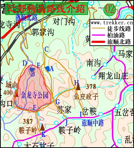 编号:02 名称:旅顺北路至旅顺中路 性质:一日徒步穿越 线路状况:强度适中,大约四到五小时路程。这是金龙寺周边的一片区域,图中画出了多种穿越方案,可走山脊,亦可走山谷,还可沿金龙寺公园的其中任一侧山脊线走,但注意应避免下到金龙寺公园内(图中红色警戒区域),我曾两次随队伍进入,无一幸免。 这一代植被相对较好,山脊、山谷偶有小路,但不是很连贯。荆棘较多,自己趟路需注意防刮。 金龙寺公园两侧的山势较陡,有大面积裸露岩石。大部分山头高程在300米上下。其中,城山最高,为400米,有台阶可从金龙寺公园内走上来。 金龙寺沟有微型的金龙水库B、郭家沟有微型的郭家沟水库A。 鞍子岭山尖上(F点、K点之间)有部队用通讯设施,有人值守,可绕过。 开发时间:2002年夏 特点:新头驴实践路线。大连近郊植被最好的地域之一,可反复穿越尝试不同行进路线。自虐腐败皆可,新头驴可以此路线做加强练习,但应做好时间预留,因距离农家相对较远,一旦辨错方向会耽误行程。 交通条件: 旅顺北路:C点沿郭家沟村道至旅顺北路、D点沿金龙寺沟村道至旅顺北路均有近一小时徒步路程。北路有大黑石至大连的近郊小巴,比较方便,进市每位两元,郭家沟口那站好象叫营城子医院。 旅顺中路:有大连经中路至旅顺的大客,有岔鞍到西山水库的小巴,但这两趟车时间间隔较大,不易掌握。我们通常做法是,沿路拦车。如碰上好心人,或许不要车费。 强度:** 难度:* 景色:***