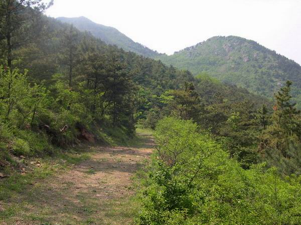 图中的浅蓝色虚线就是穿越路线,不是很长,景色跟大连周边的身体相仿,植被较密,没什么特别的陡坡需要绕行,山脊比较好走,局部有一点小砬子。