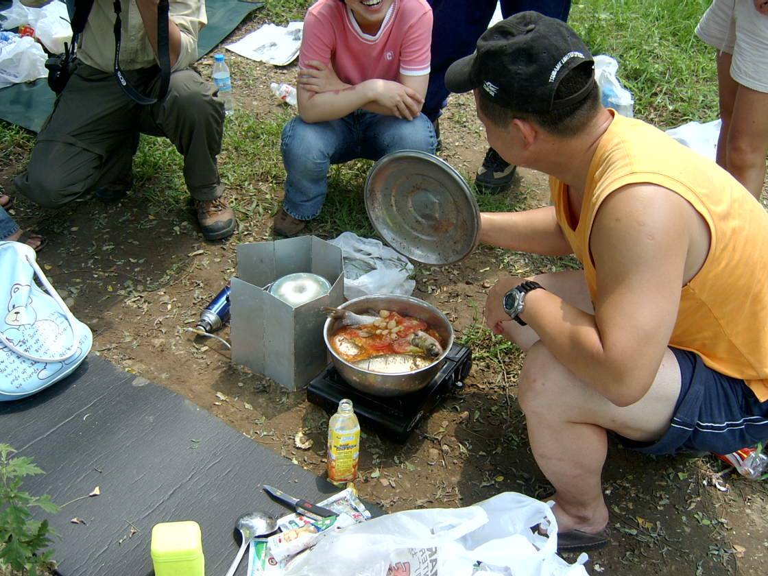 一般人在无聊之极的时候,除了吃、喝、玩、乐外,最大的弊病就是会产生盲目崇拜。这不,在众多参赛队员正在战高温,斗酷暑的时候,大本营产生了一位明星——黄衣大哥(抱歉,把名字忘了),这位GG好生了得,首先是锅、碗、瓢、盆,样样具全,达到大本营的第一件事就是煮了满满一锅茶叶鹌鹑弹,由于味道可口,大本营人员纷纷中弹。下午,在格呢TX和我的努力下,弄到4条刚从水库钓上的新鲜鲢鱼,于是黄衣大哥手起刀落,大展厨艺,结果可想而知......就这样,明星诞生了,一时间各种长枪短炮纷纷闪向GG,当然GG也得心应手的摆出各种掌勺PS谋杀菲林。不过GG得意忘形时捧鱼就亲的PP不能让别人知道,要不然后果很严重,嘿嘿。[upload=jpg]UploadFile/2005-7/200573144759201.jpg[/upload] CVuq2yc5.jpg l9NeVAZr.jpg 8I8uJxbl.jpg RM8qs0ld.jpg yWifhY23.jpg